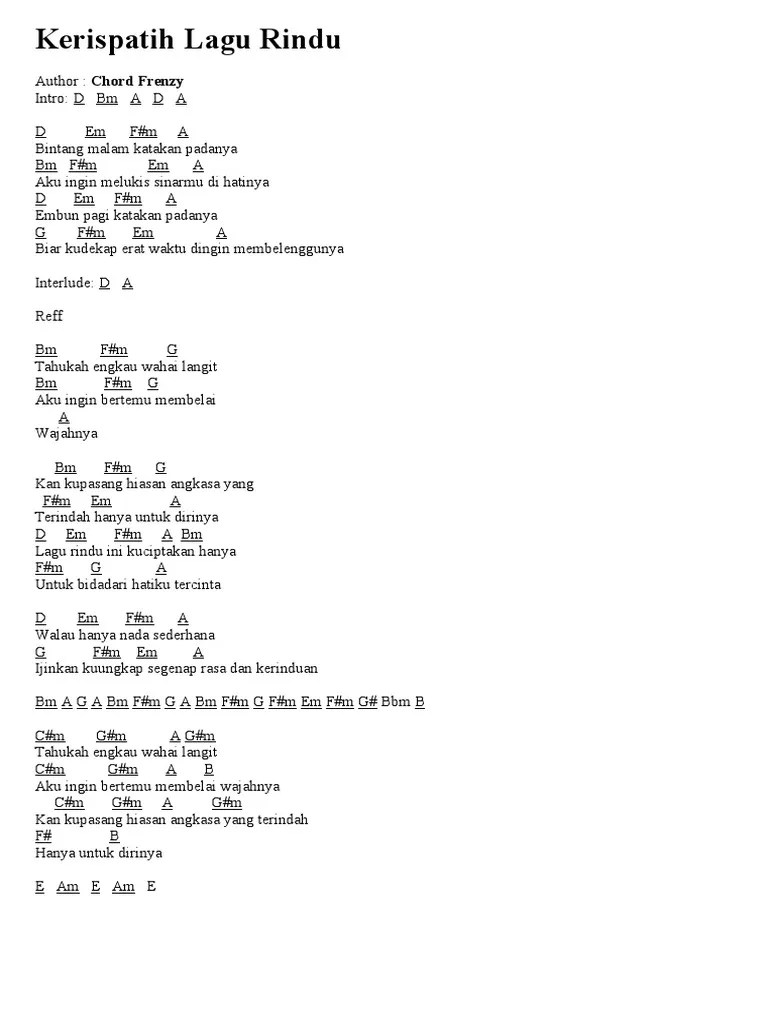 Bm f#m em a aku ingin melukis sinarmu di hatinya. C am g c g c dm em g bintang malam katakan padanya am em dm &n. intro: d g d d g d a d em f#m a bintang malam katakan padanya bm f#m em a aku ingin melukis sinarmu di hatinya d em f#m a embun pagi katakan padanya g f#m . D em d a bintang malam katakan padanya. Dirilis pada 2005, "lagu rindu" merupakan lagu kerispatih yang menjadi bagian dari album kejujuran hati. intro: d g d d g d a d em f#m a bintang malam katakan padanya bm . C dm em g embun pagi katakan padanya D d g/d d a bintang malam katakan padanya bm7 f#m7 g a aku ingin melukis sinarmu dihatinya d g/d d a embun pagi katakan padanya g f#m7 em7 a d biar . D bm a d a. D em f#m a bintang malam katakan padanya. Am em dm g aku ingin melukis sinarmu di hatinya. Am dm e am am dm bintang malam, g c sampaikan padanya, am dm g c C am g c g.